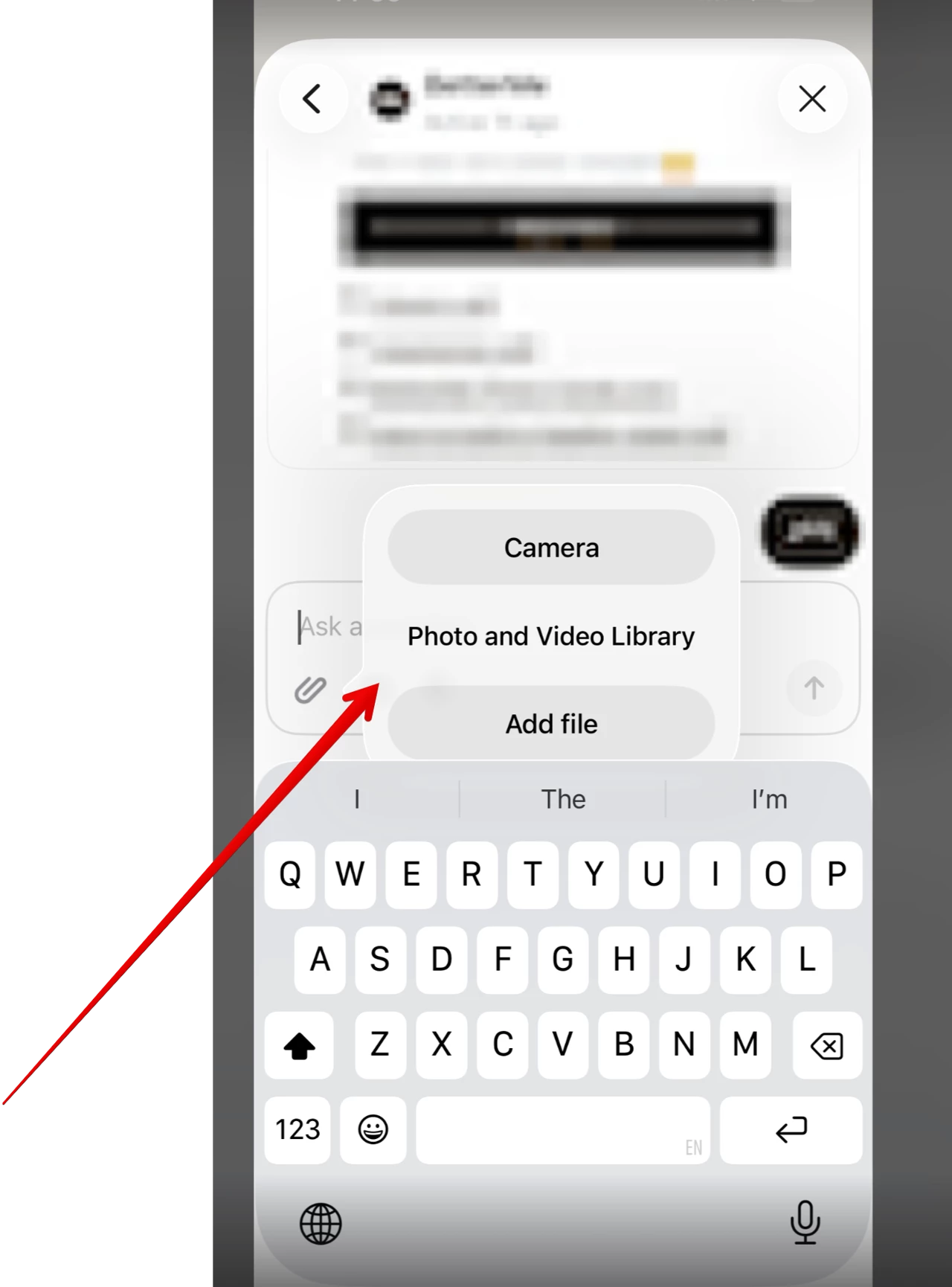 When tapping the attachment button in the message input area, the popup with attachment sources appears (Camera, Photo and Video Library, Add file). However, there are a couple of visual issues: